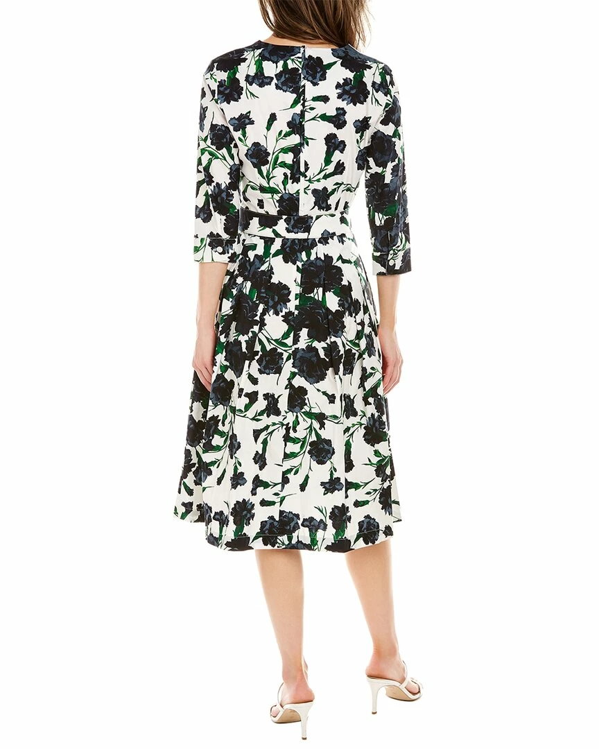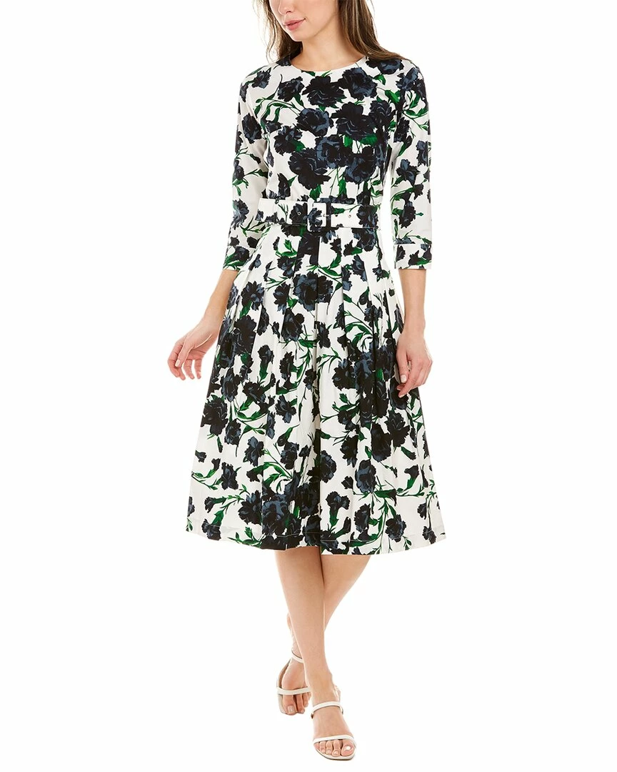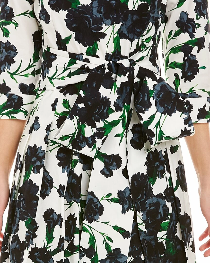 - Florance A-Line Dress in carnation white black with 3/4-length sleeves, button cuffs, pleated skirt, dual side on-seam pockets, self-tie sash at waist, and removable belt