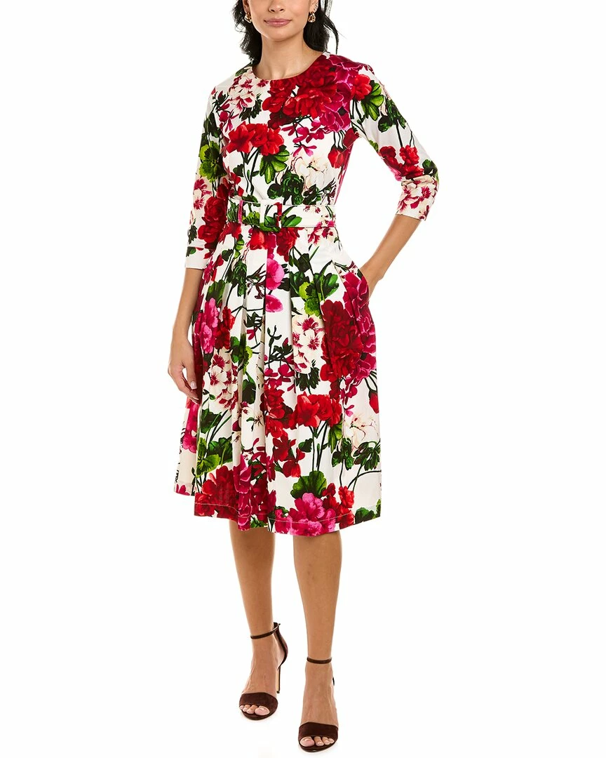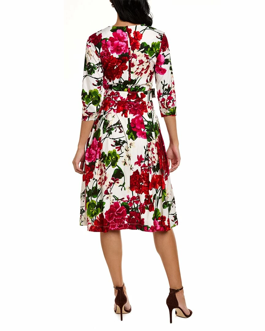 - Florance Midi Dress in white red bougenvillea blossom with 3/4-length sleeves, pleated skirt, side slip pockets, and belted waist