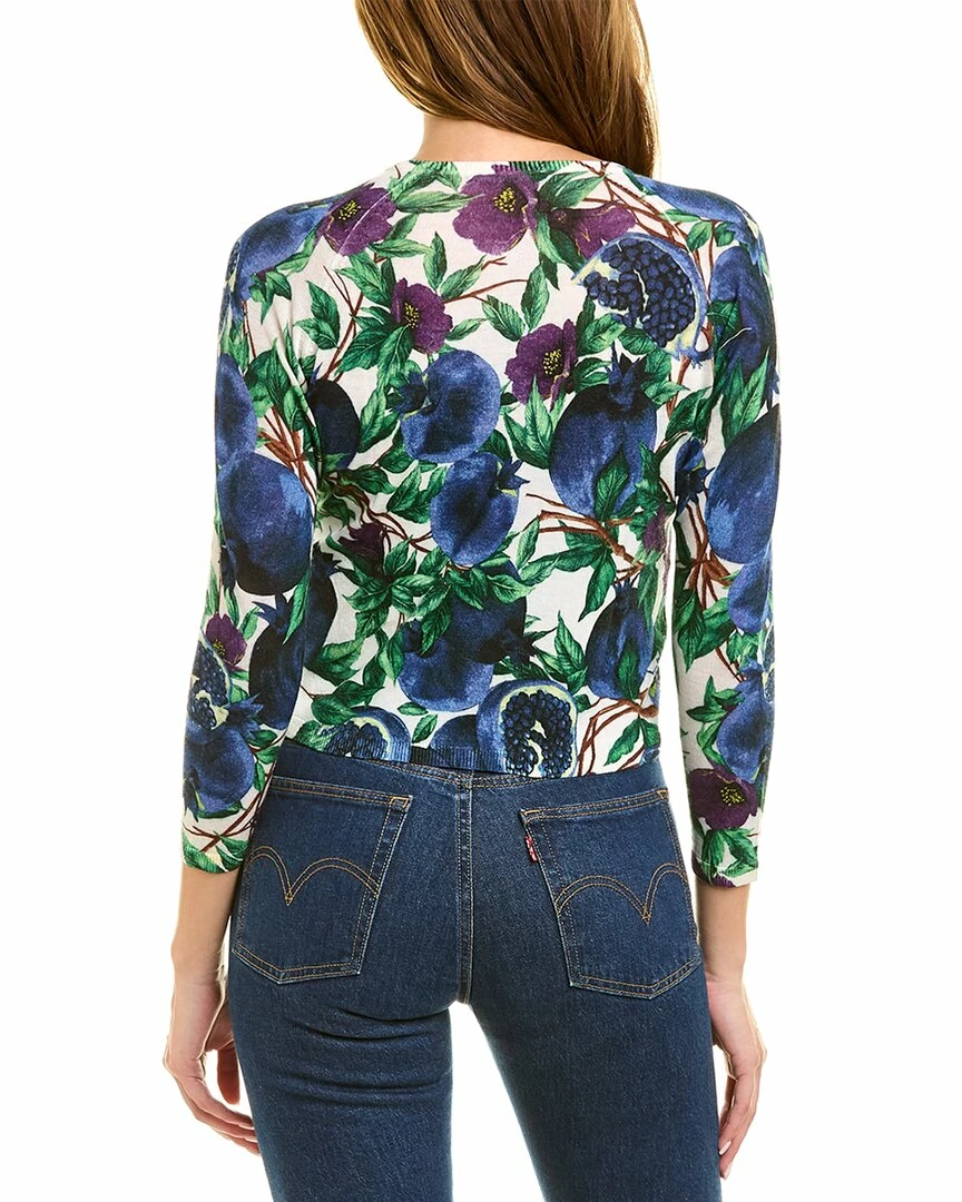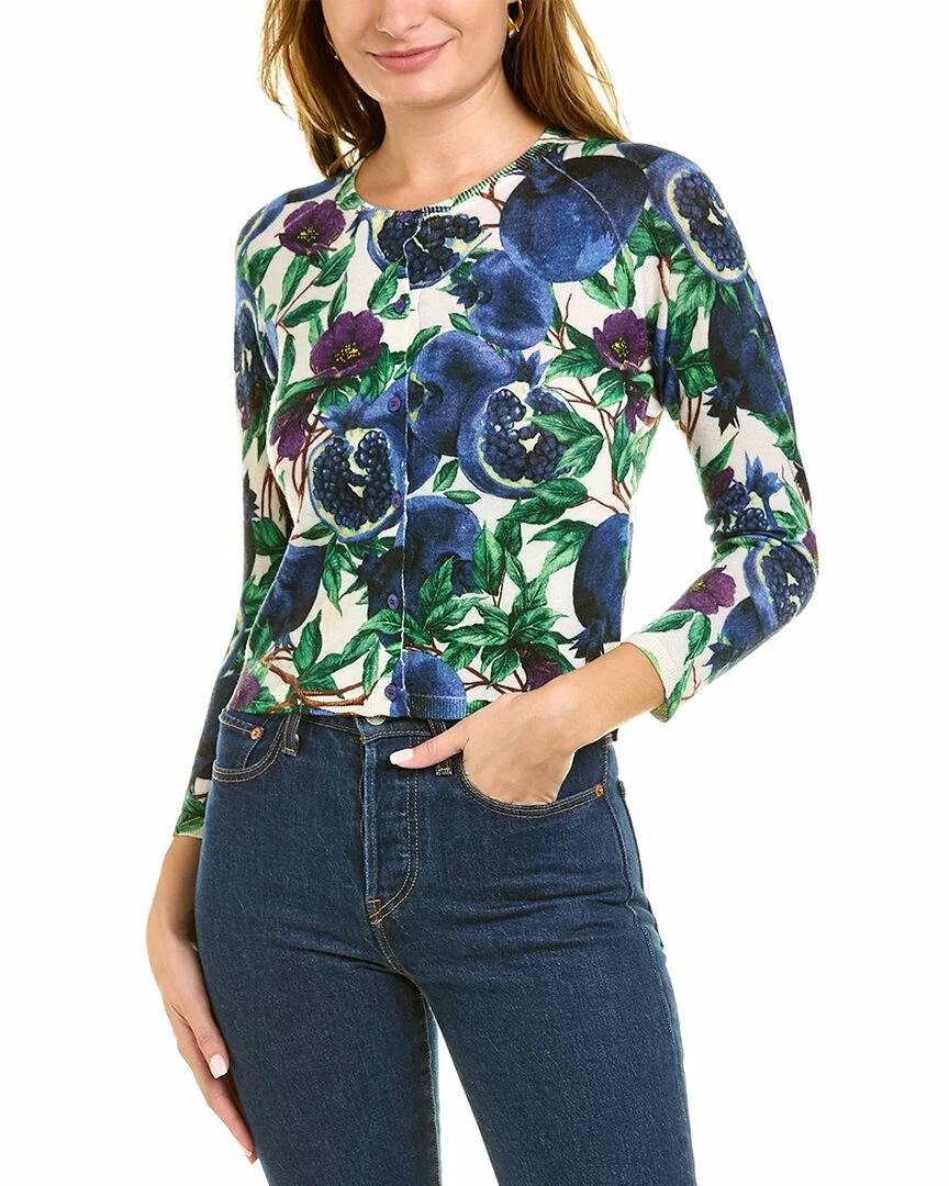 - Lynette Silk & Cashmere-Blend Cardigan in white and cobalt pomegranate with cropped design