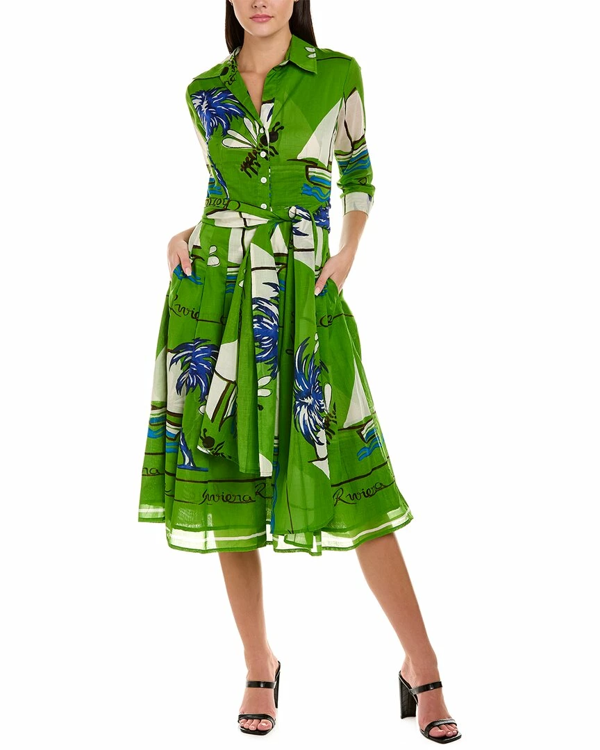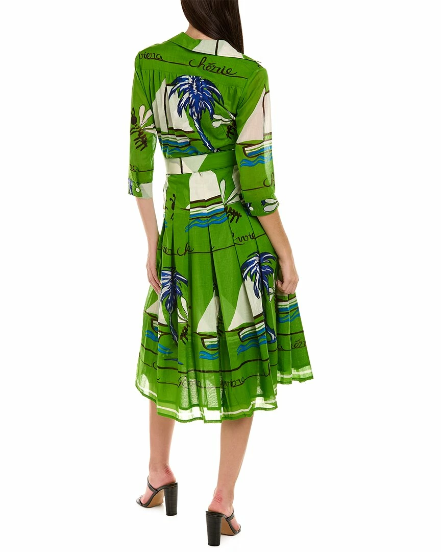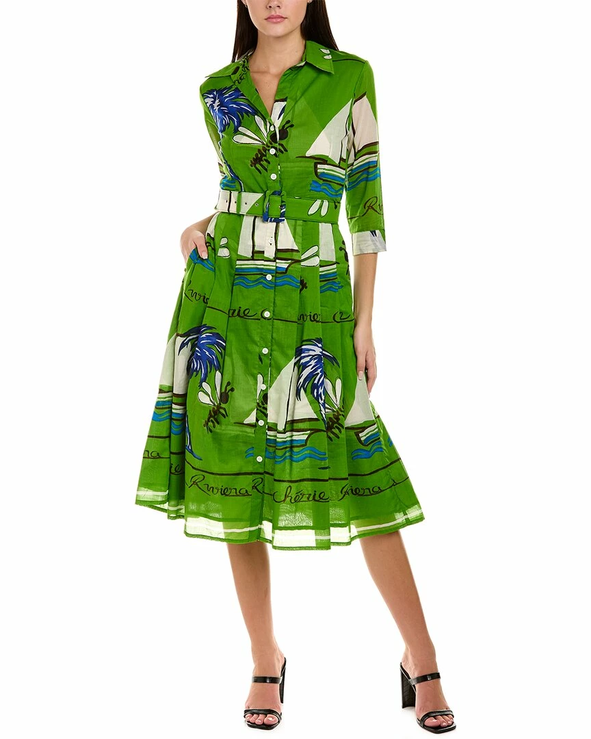 - Patricia Dress in white green riviera cherie with spread collar, 3/4-length sleeves, button cuffs, pleated skirt, dual side on-seam pockets, and self-tie sash at waist