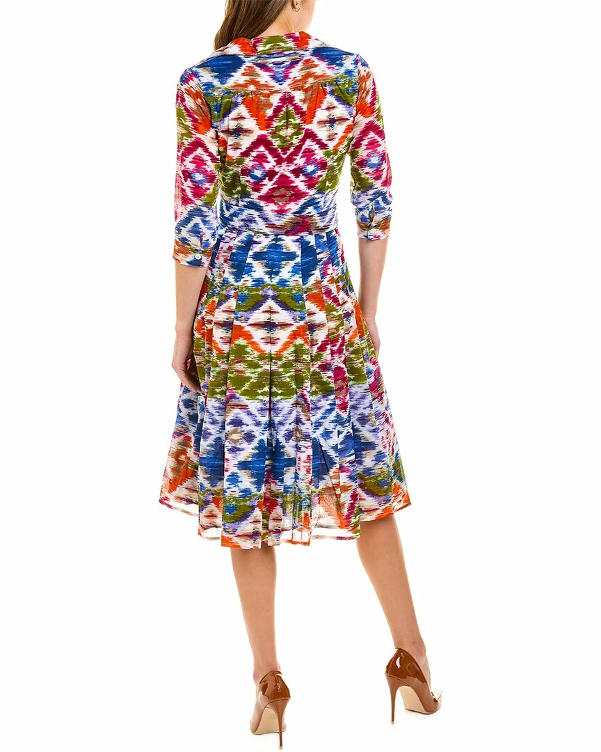 - Patricia Shirtdress in multicolor diamond ikat with 3/4-length sleeves, pleated skirt, side seam pockets, removable belt, and tie sash