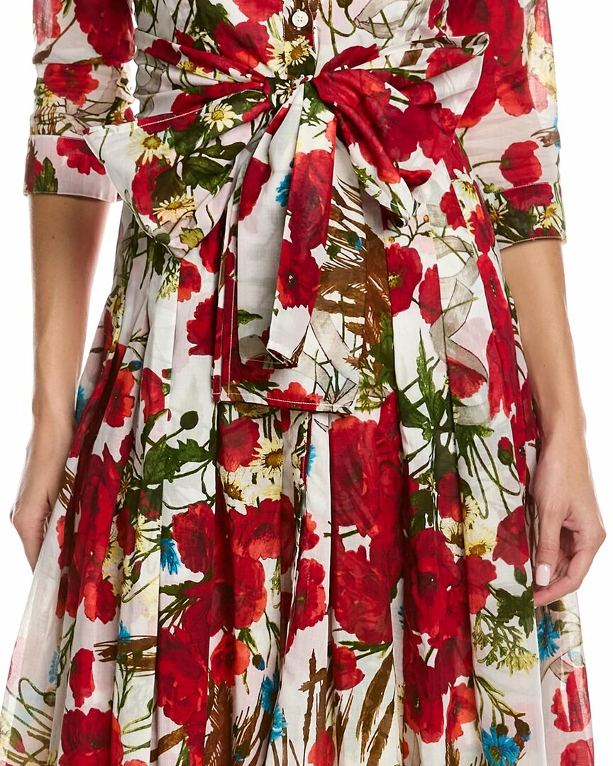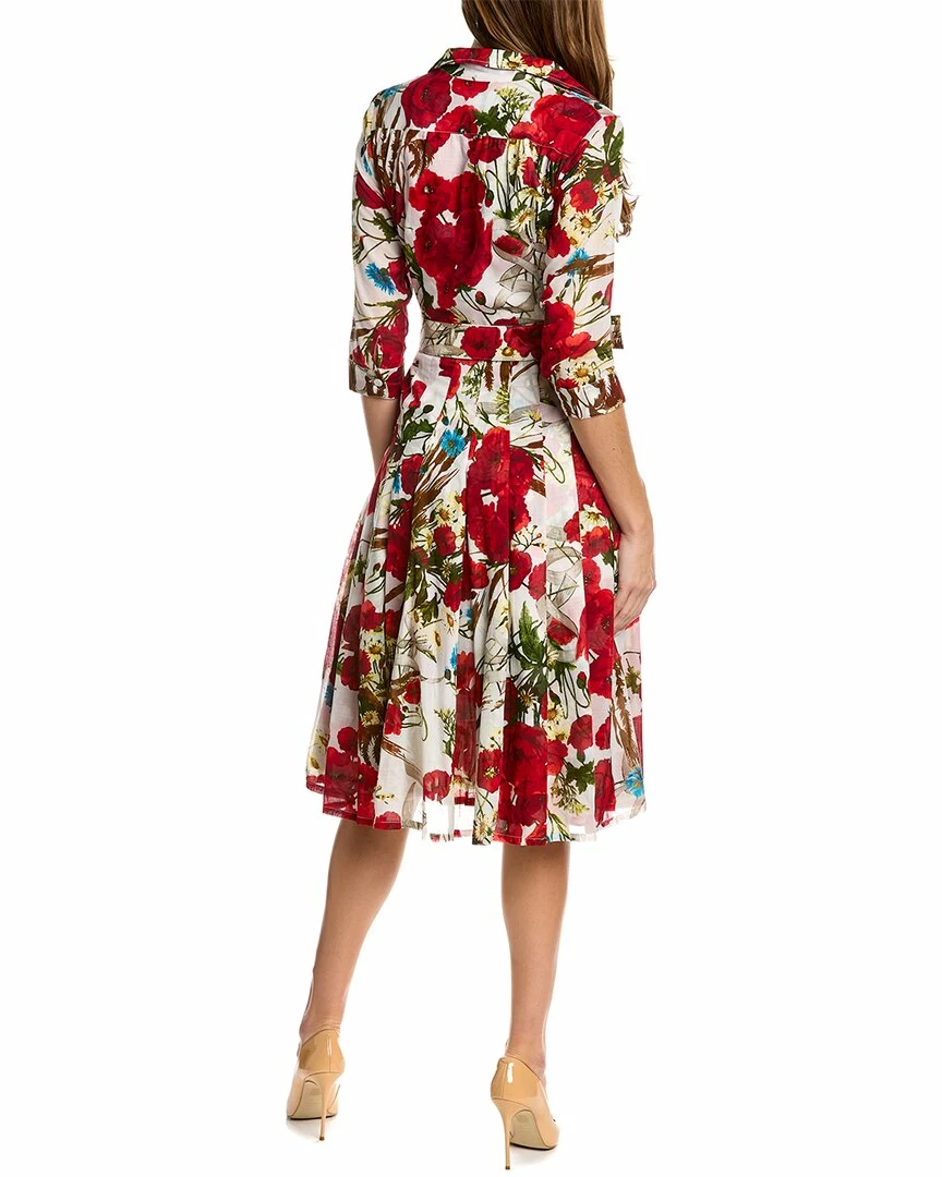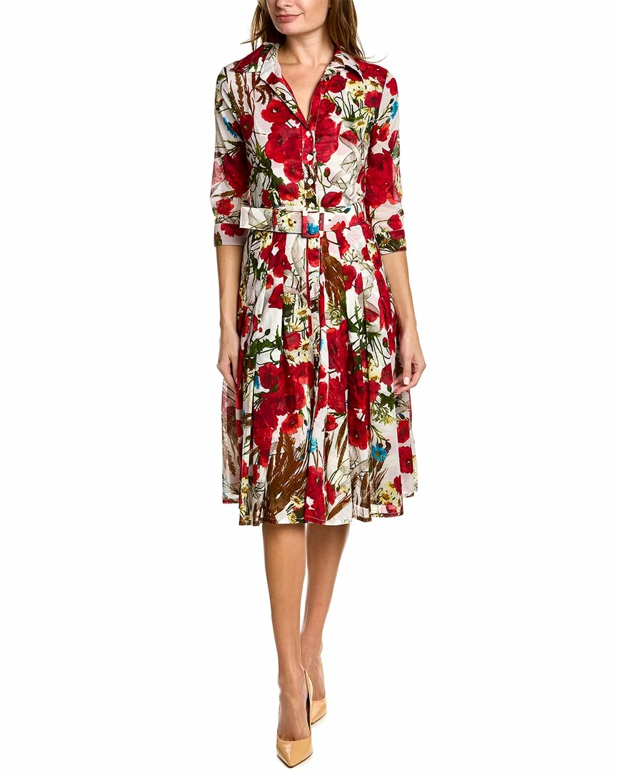 - Patricia Shirtdress in white Tuscani Arancia with 3/4-length sleeves, pleated skirt, side seam pockets, removable belt, and tie sash