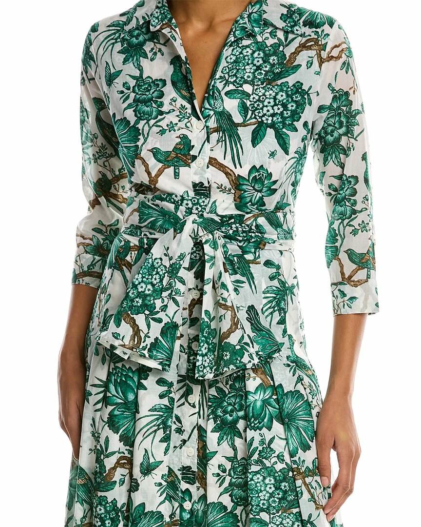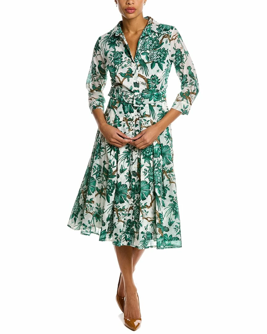 - Patricia Shirtdress in white ivy green villeneuve with 3/4-length sleeves, pleated skirt, side seam pockets, removable belt, and tie sash
