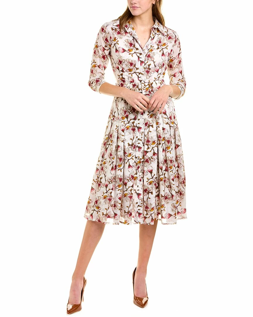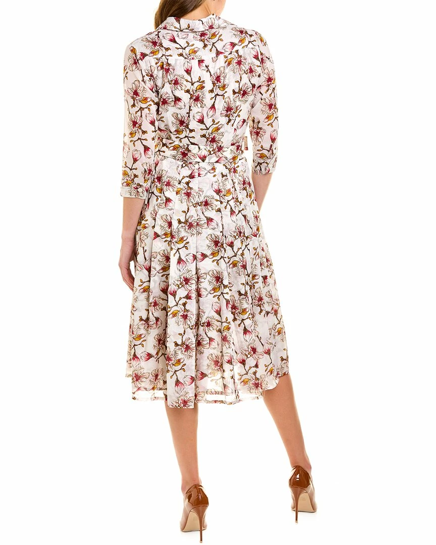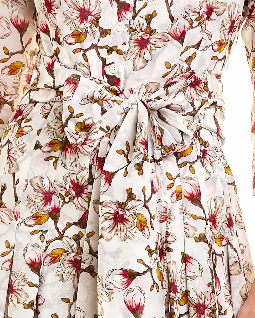 - Patricia Shirtdress in ivory and rose Cardiff magnolia with 3/4-length sleeves, pleated skirt, side seam pockets, removable belt, and tie sash