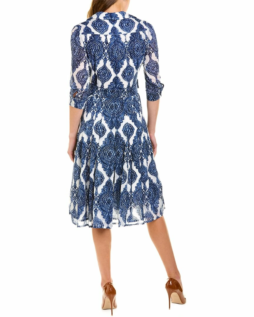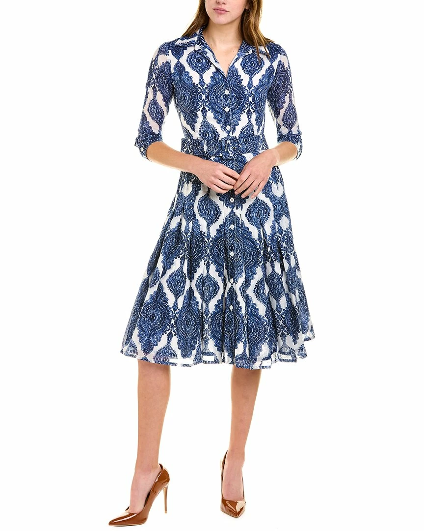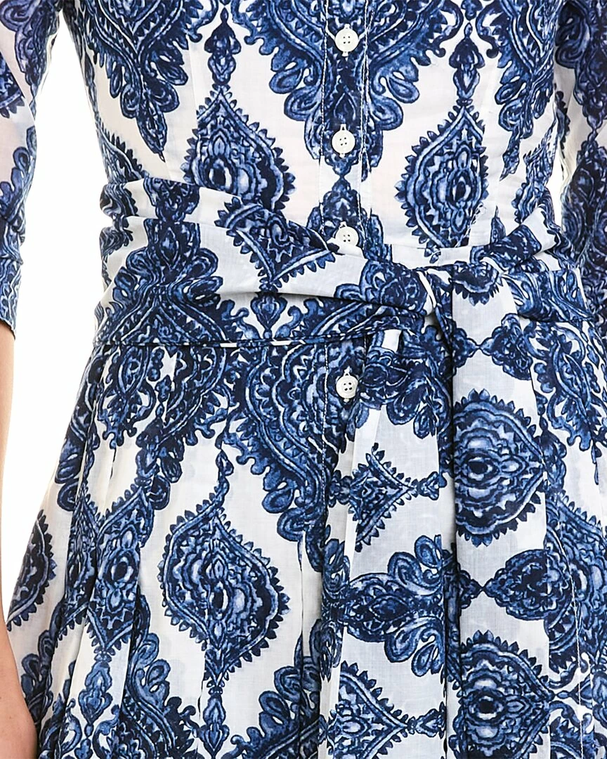 - Patricia Shirtdress in indigo Damascus wallpaper with 3/4-length sleeves, pleated skirt, side seam pockets, removable belt, and tie sash