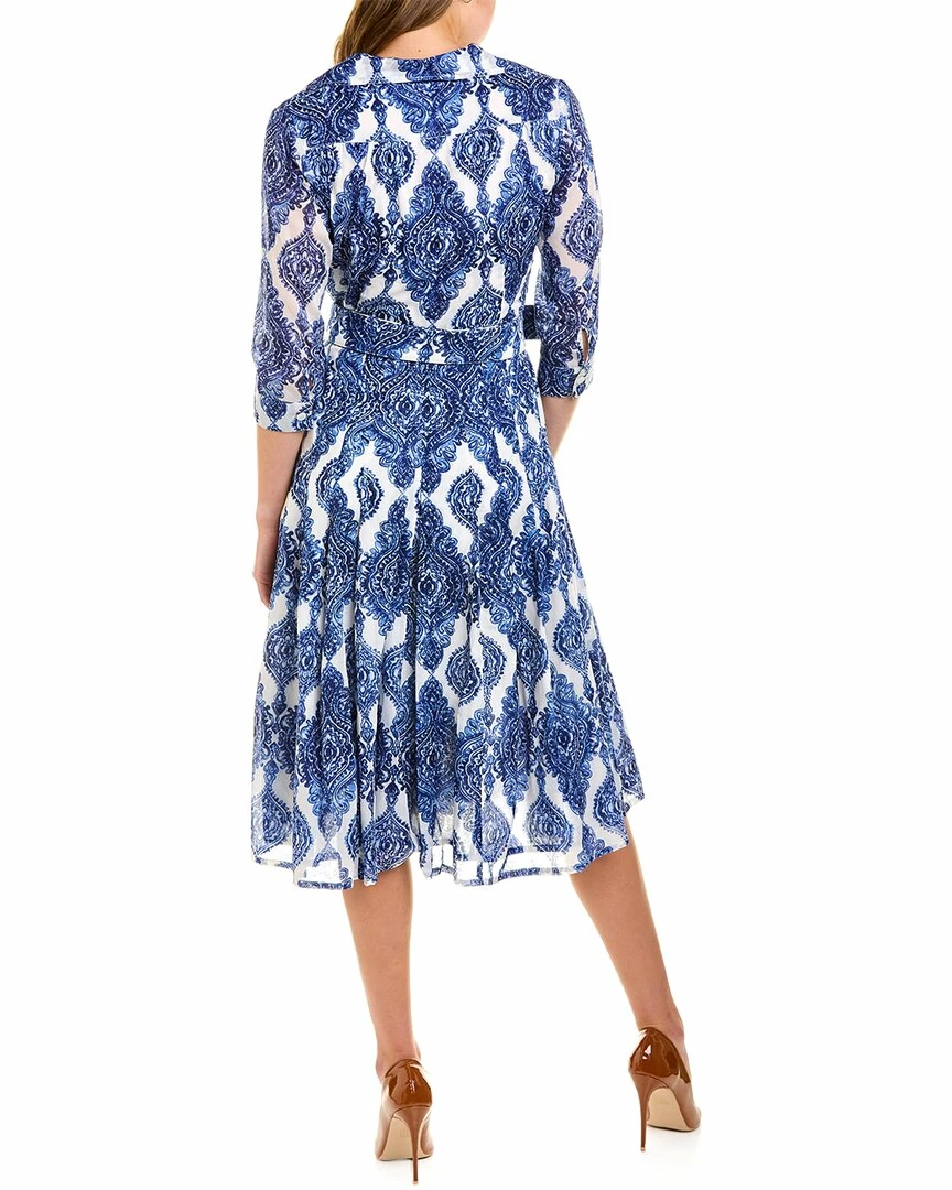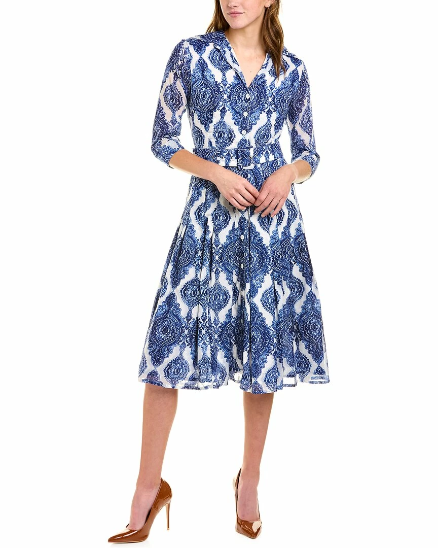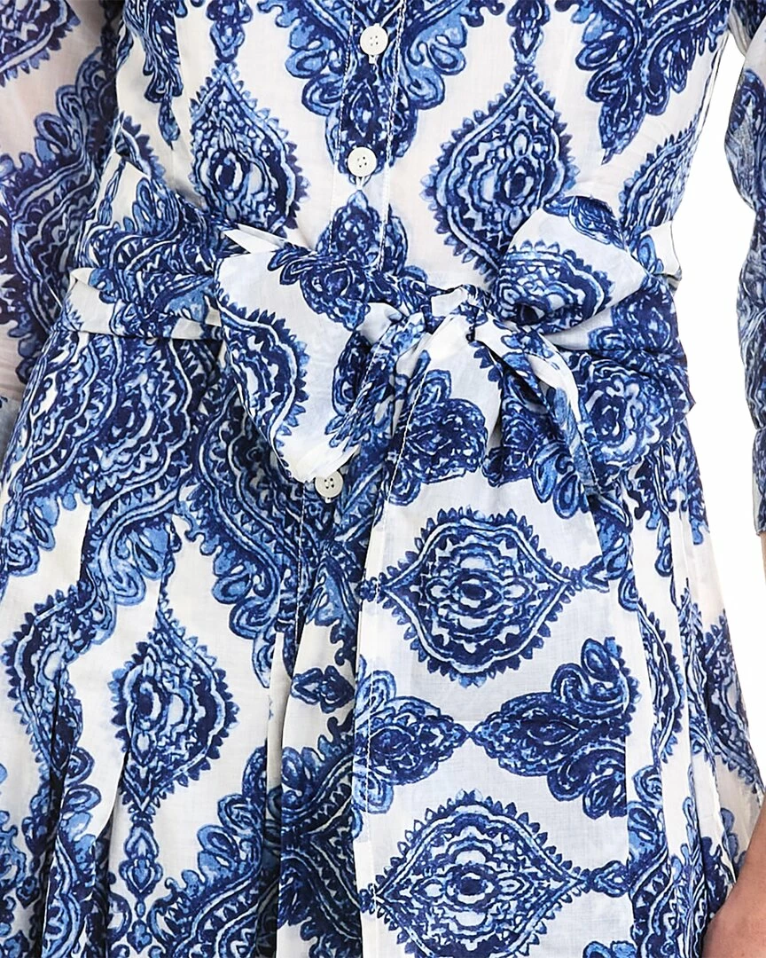 - Patricia Shirtdress in indigo Damascus wallpaper with 3/4-length sleeves, pleated skirt, side seam pockets, removable belt, and tie sash