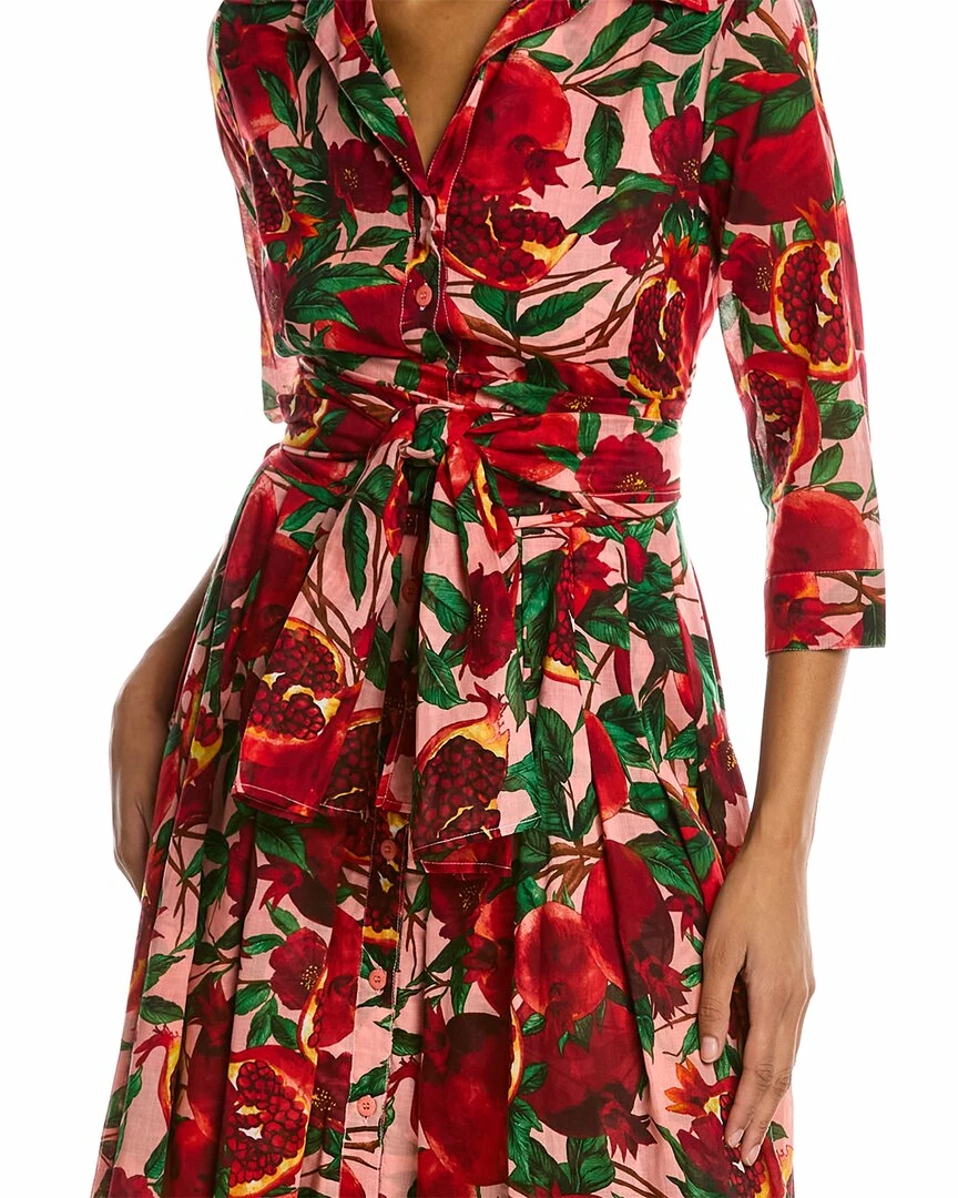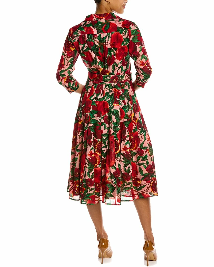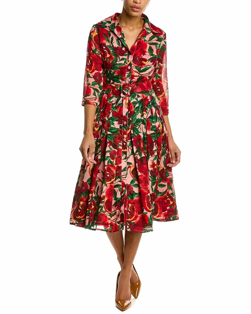 - Patricia Shirtdress in soft coral red pomegranate gro with 3/4-length sleeves, pleated skirt, side seam pockets, removable belt, and tie sash