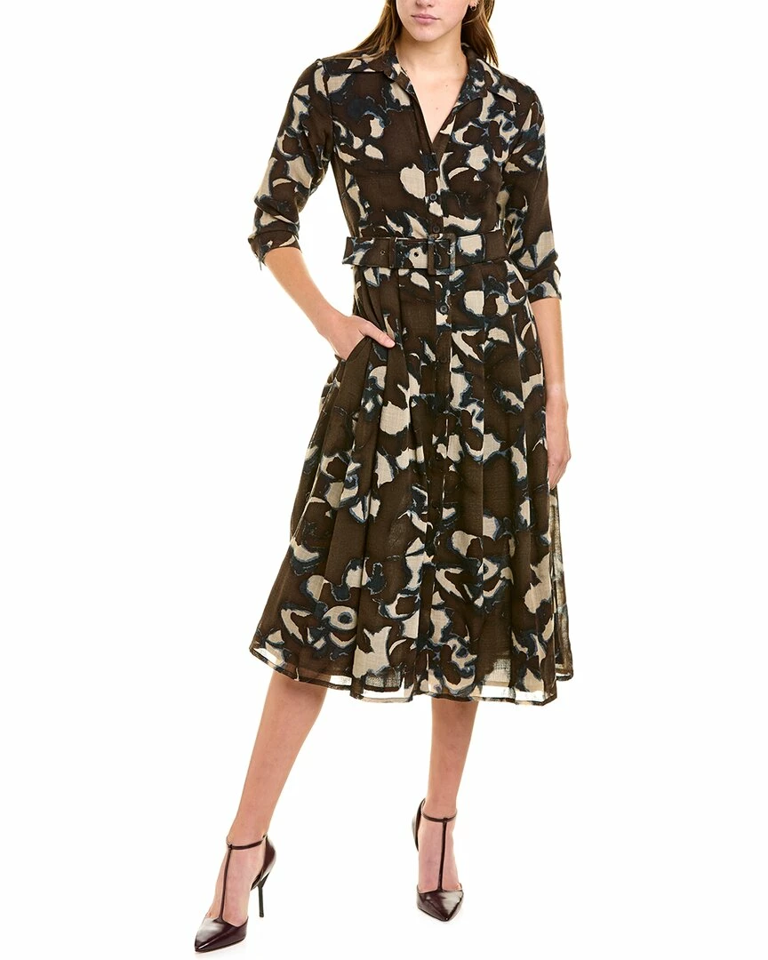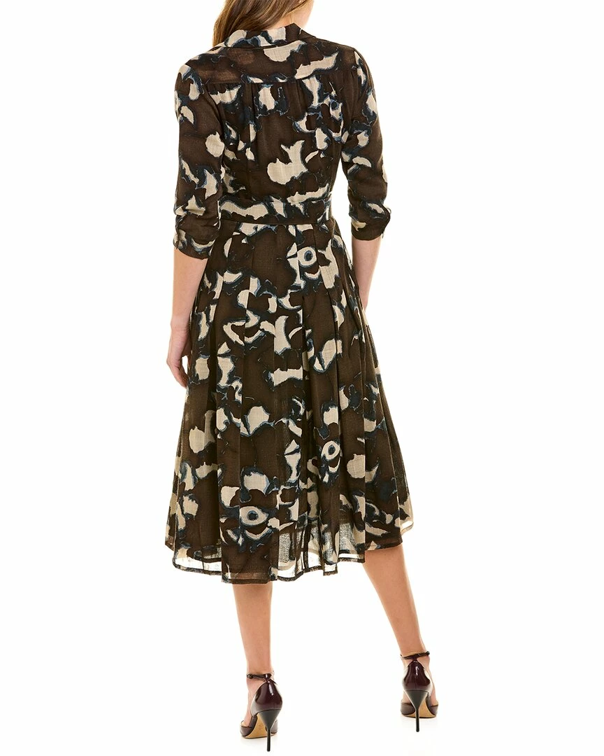 - Patricia Wool Shirtdress in taupe abstract pace with 3/4-length sleeves, pleated skirt, side seam pockets, removable belt, and tie sash