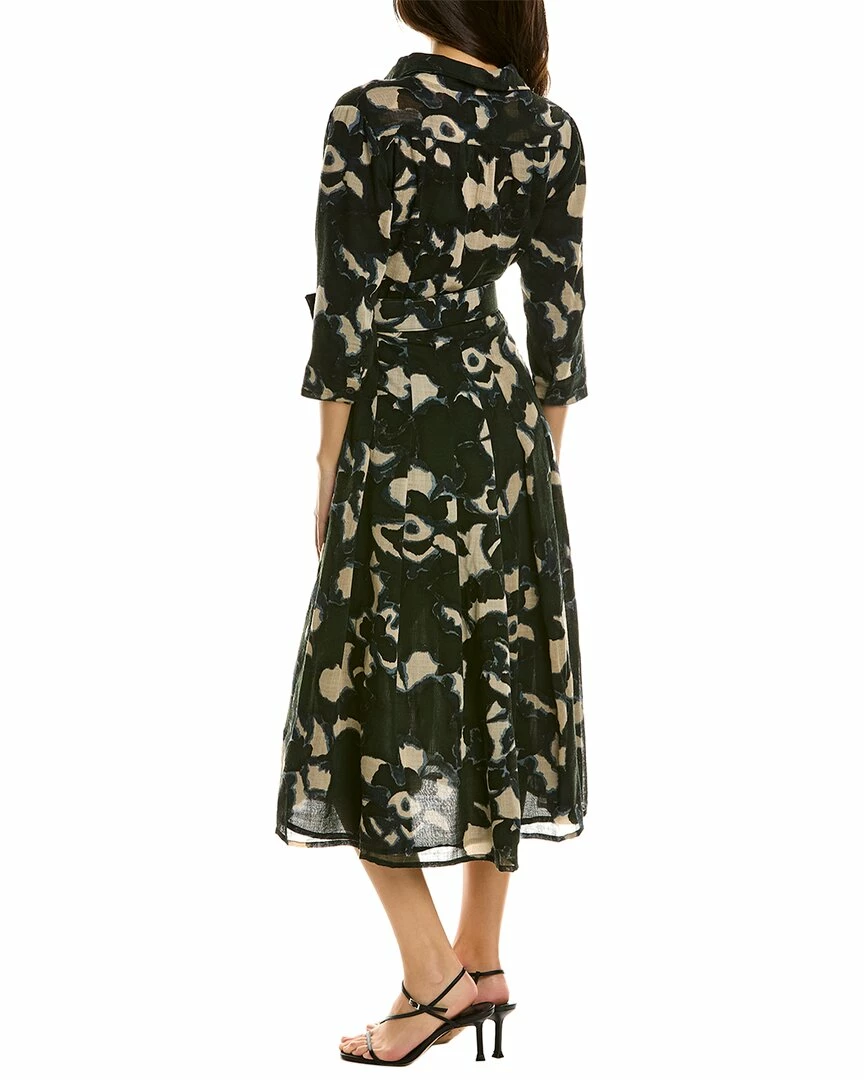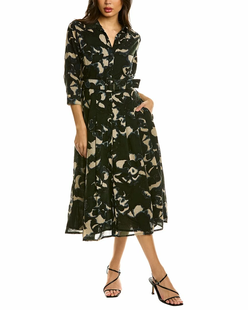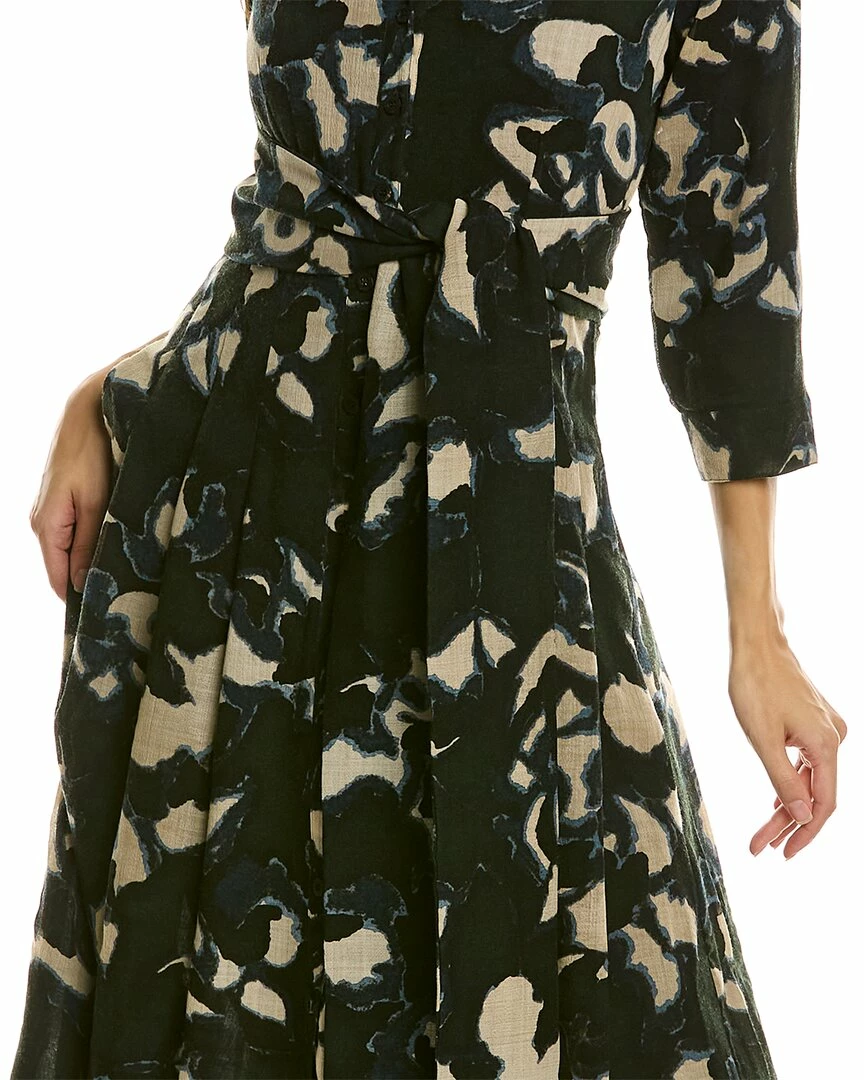 - Patricia Wool Shirtdress in olive green abstract pace with 3/4-length sleeves, pleated skirt, side seam pockets, removable belt, and tie sash
