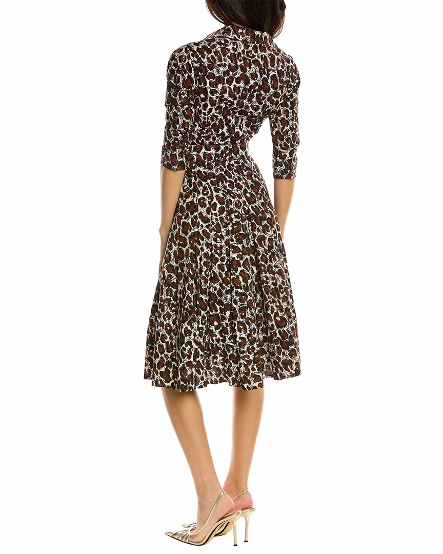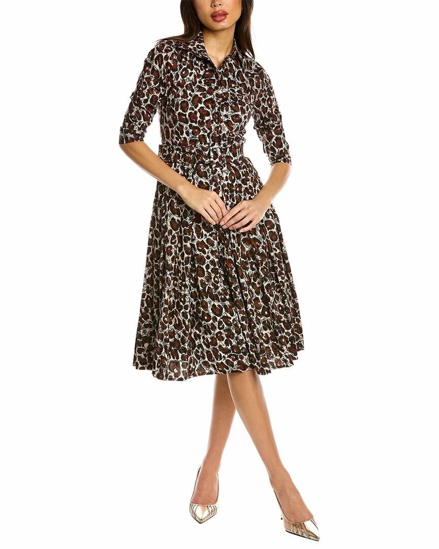 - Patricia Wool & Silk-Blend Shirtdress in white brown graffiti leopard with spread collar, button cuffs, belted waist, pleated skirt and dual side seam pockets