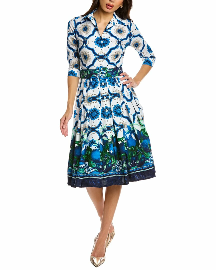 - Patricia Wool & Silk-Blend Shirtdress in blue sicilian lemon with spread collar, button cuffs, belted waist, pleated skirt and dual side seam pockets