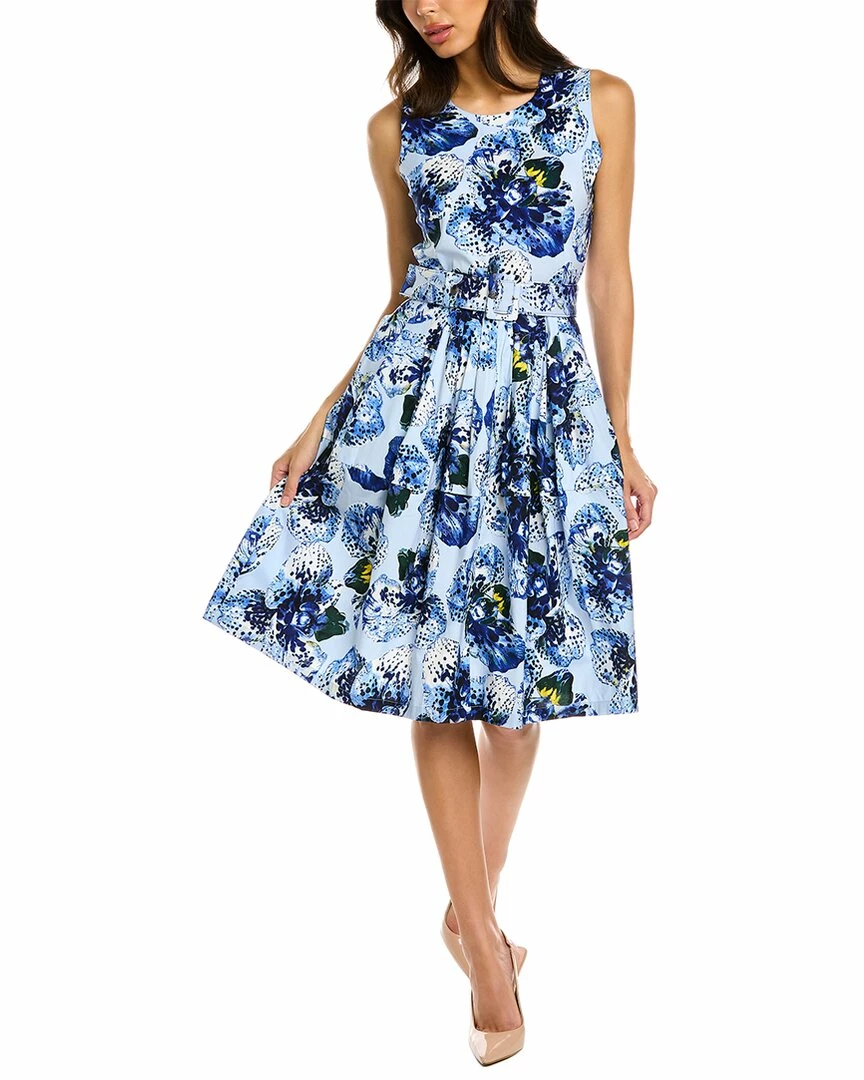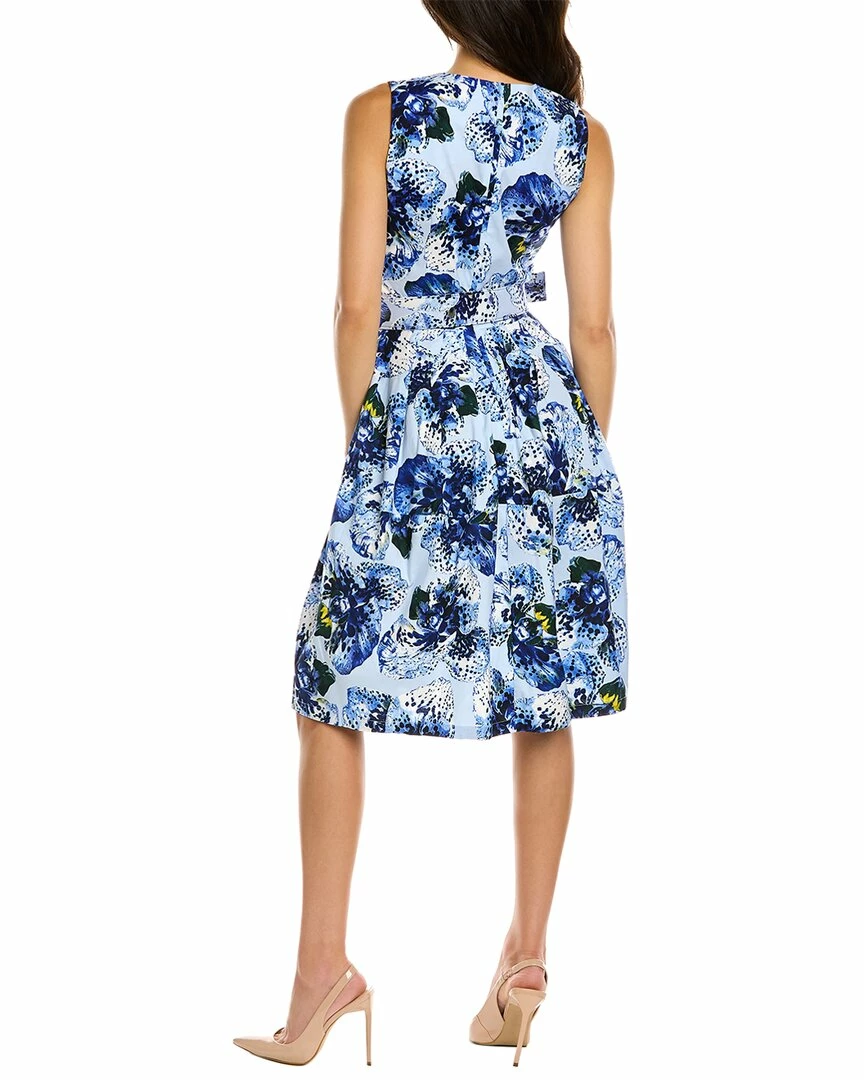 - Rachel Wool & Silk-Blend A-Line Dress in soft blue speckled orchid with belted waist, pleated skirt, and dual side seam pockets